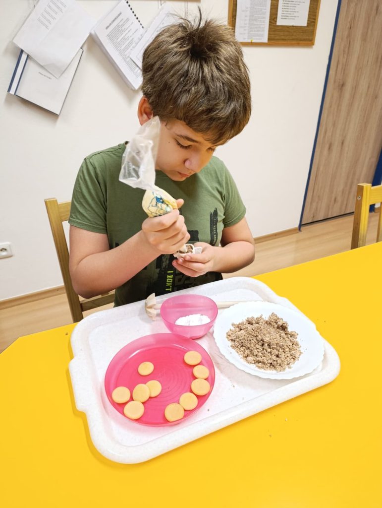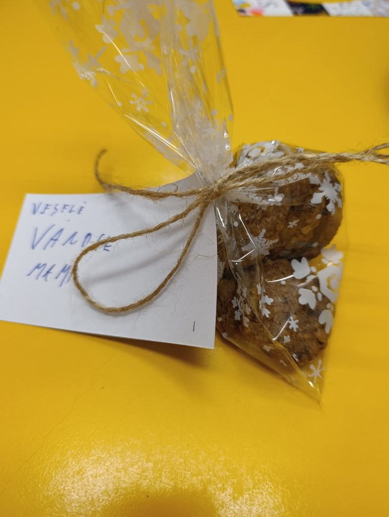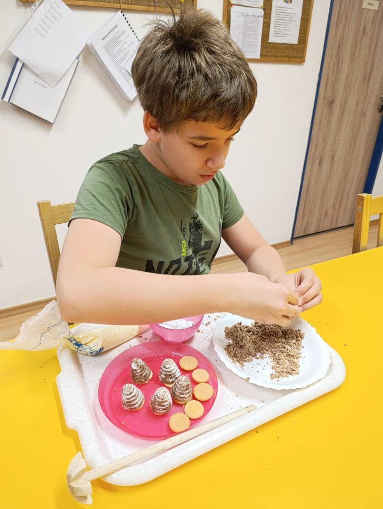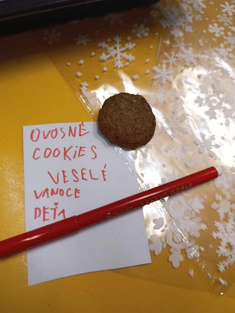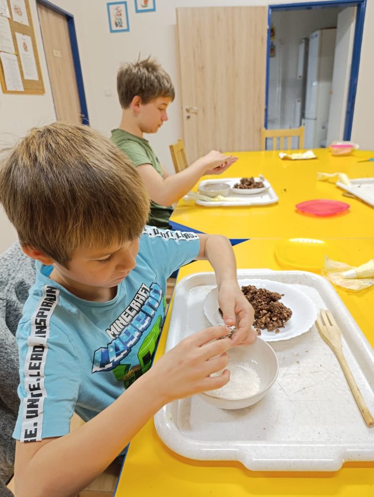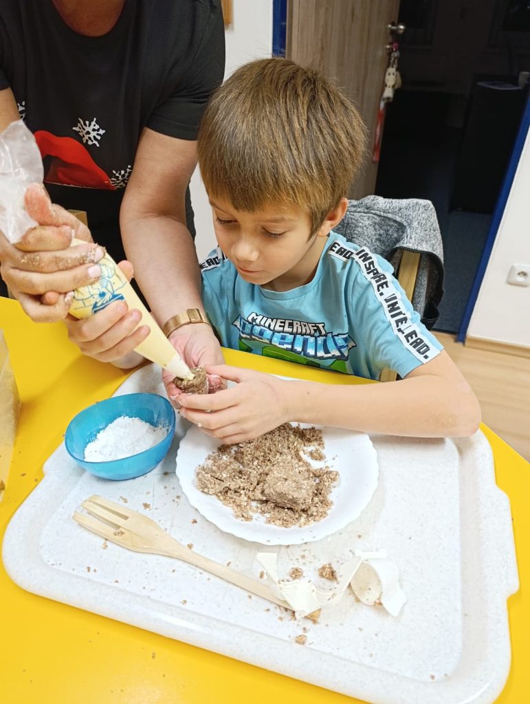 Pak už jsme se mohli pustit do pečení. Na řadu přišly klasické druhy cukroví jako např. vosí hnízda, ale i zdravější alternativy – ovesné sušenky. Práce se sladkým těstem děti moc bavila 🙂