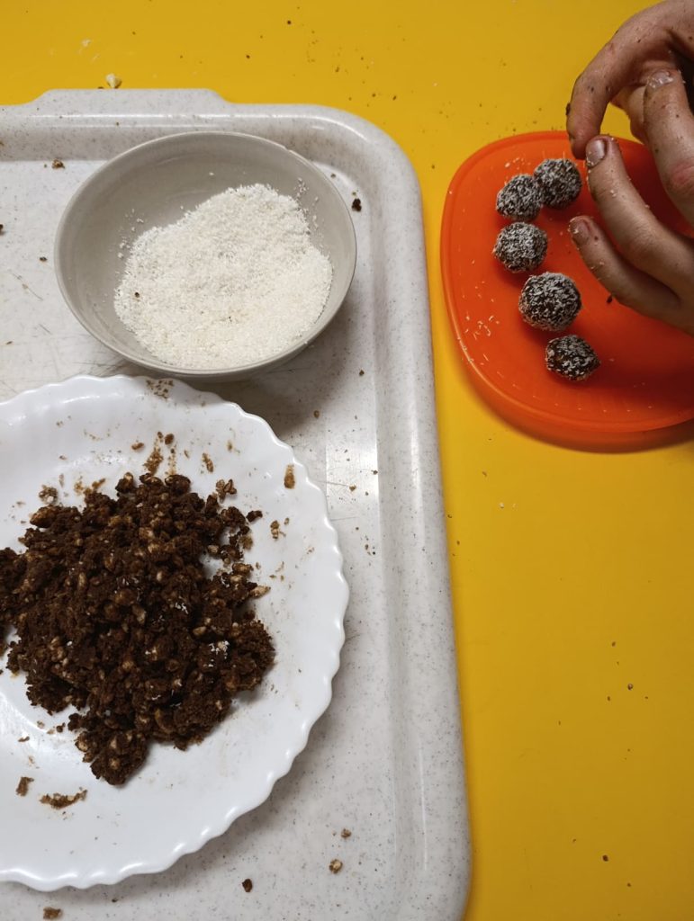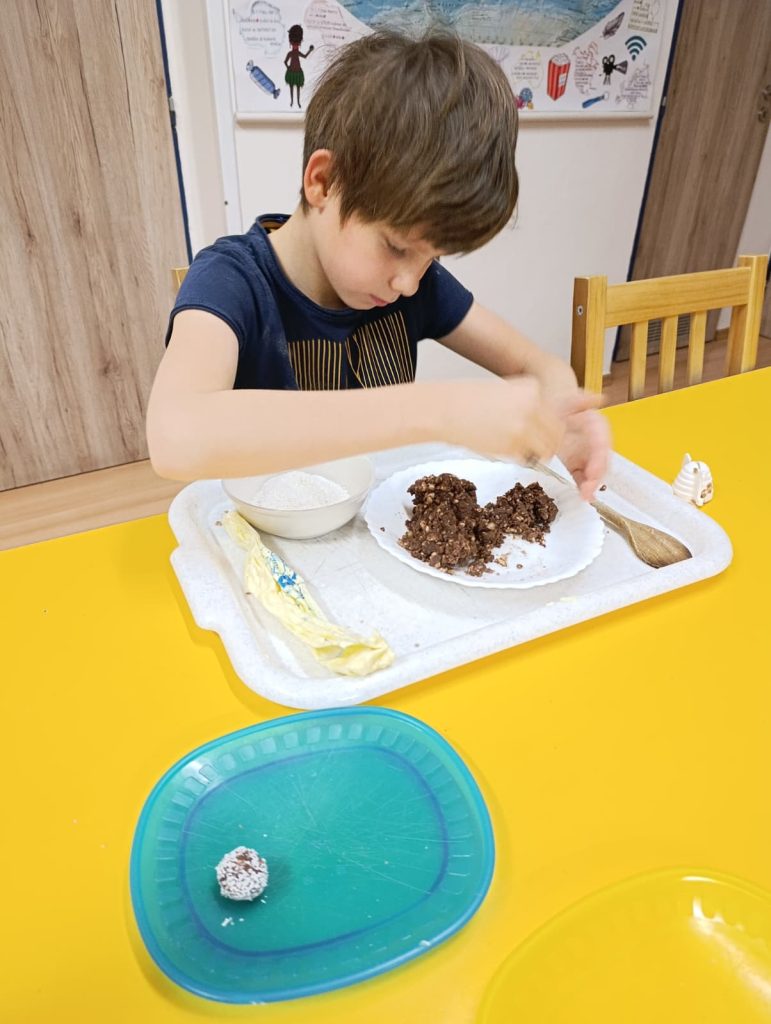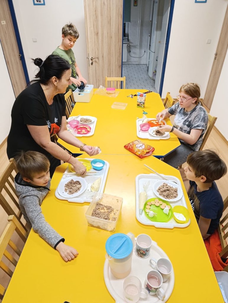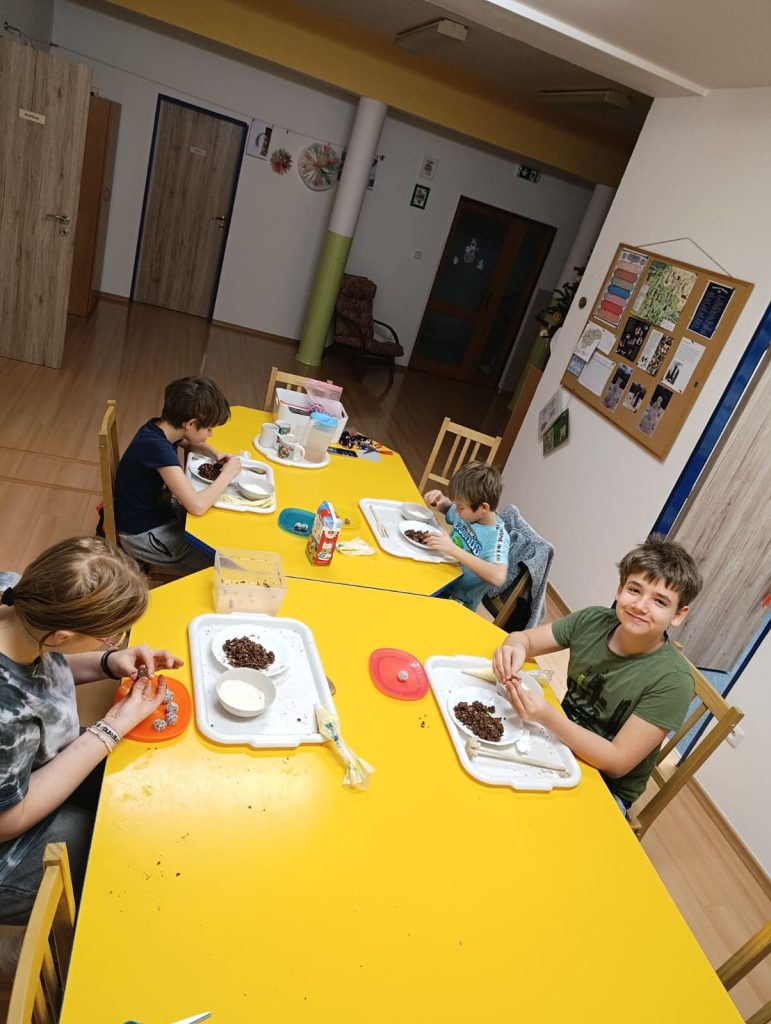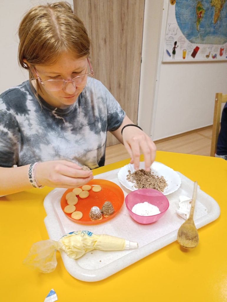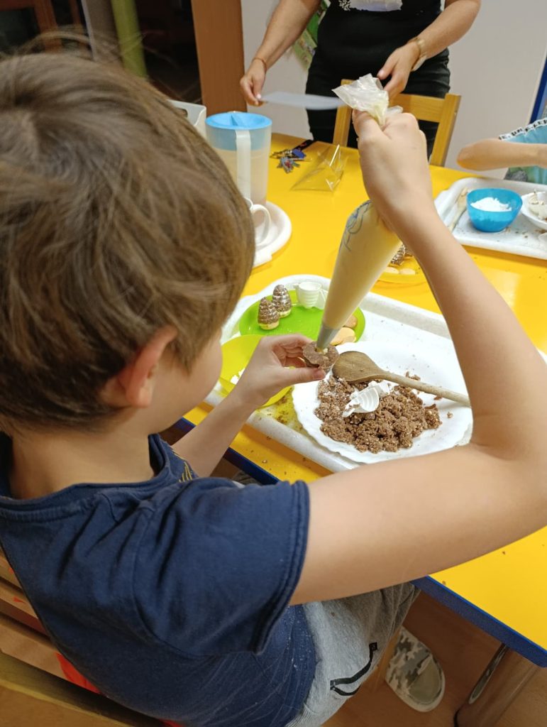 Pak už jsme se mohli pustit do pečení. Na řadu přišly klasické druhy cukroví jako např. vosí hnízda, ale i zdravější alternativy – ovesné sušenky. Práce se sladkým těstem děti moc bavila 🙂